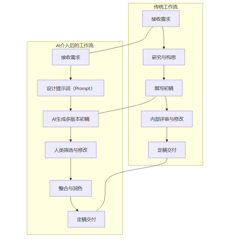 传统的文案工作流是一个完整的创作闭环,而AI的介入则将其彻底打碎和重组。