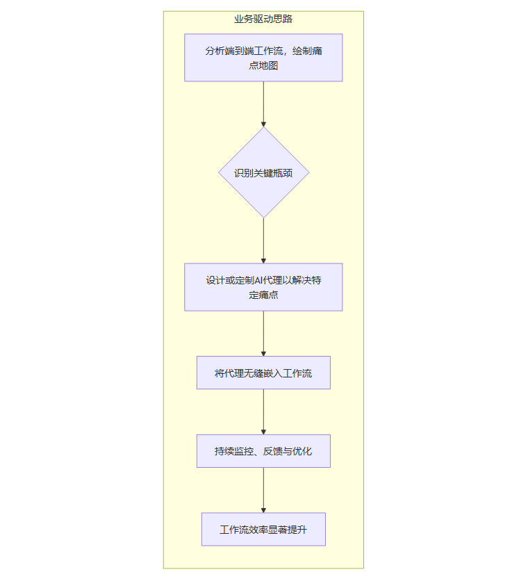 这种思路的起点是“我们的业务流程中存在什么问题?AI代理能否帮助解决?”。团队会先进行彻底的流程分析,然后设计或选择最适合该特定流程的AI代理。