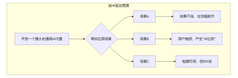 这种思路的起点通常是“我们有一个很酷的AI代理技术,能用它来做什么?”。团队可能会开发一个功能强大的通用代理,然后尝试将其应用到各种看似合适的场景中。
