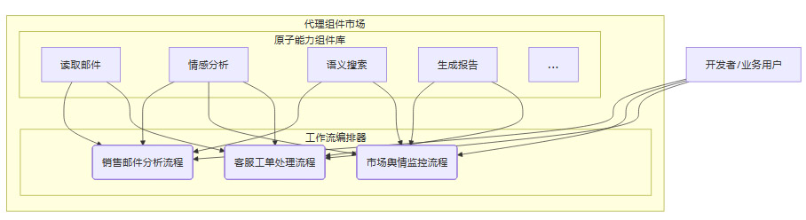 例如,销售团队需要一个代理来分析客户邮件,市场团队需要一个代理来分析社交媒体评论,客服团队需要一个代理来分析用户反馈工单。尽管业务场景不同,但这三个代理的核心能力都包含“文本情感分析”、“关键信息提取”等通用任务。如果为每个场景都从零开始开发,无疑是巨大的资源浪费。