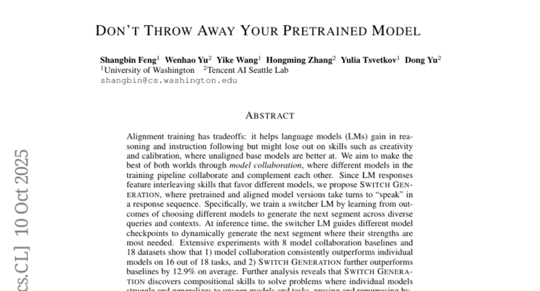 近期,由华盛顿大学与腾讯AI西雅图实验室联合发表的研究(arXiv:2510.09913v1),为解决这一矛盾提供了全新的系统性思路。他们提出的“切换生成”(Switch Generation)框架,不再执着于打造一个无所不能的“全才”模型,而是构建了一个由不同阶段模型组成的“专家团队”。通过一个轻量级的智能调度器,让这些模型在一次生成任务中协同作战,各展所长。这标志着AI系统设计理念的一次重要演进,从追求单体模型的极限性能,转向探索多模型协作的集体智能。本文将对该技术体系进行深度剖析,阐述其核心机制、实证效果、工程挑战与深远的行业启示。
