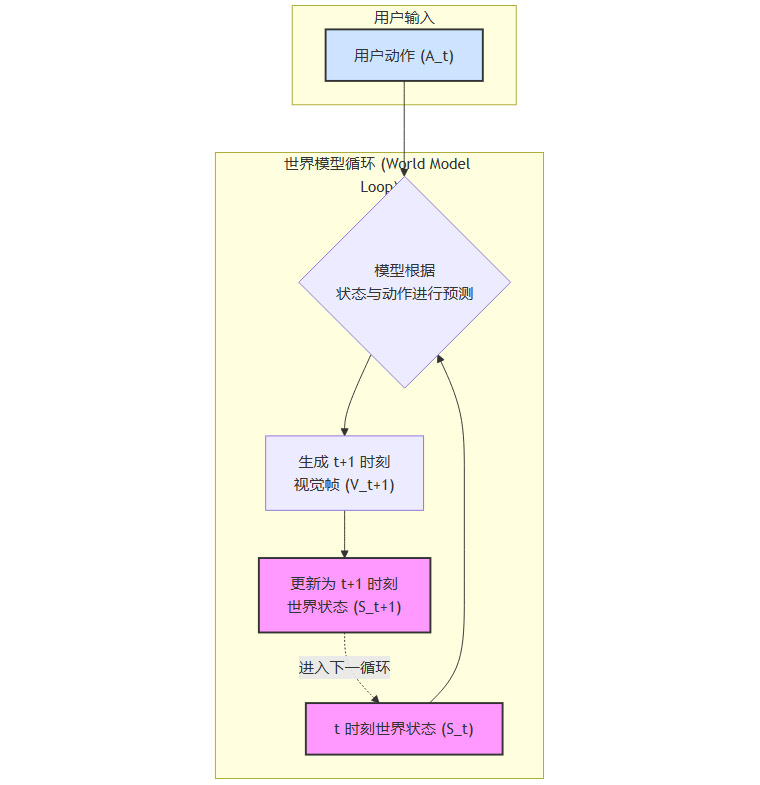 状态输入:模型接收当前世界的状态,这可能是一个或多个历史帧、内部隐状态向量,以及用户的操作指令(如“向前走”、“拿起杯子”)。
