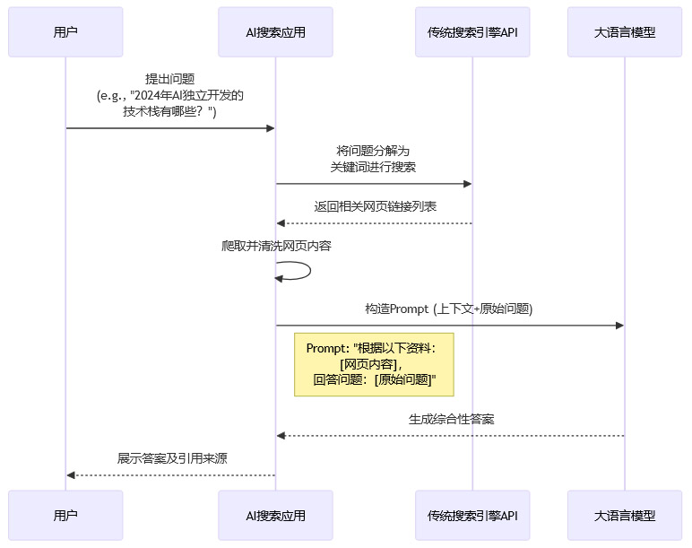AI搜索的底层技术大多基于RAG架构。其工作流程可以简化为以下几步。