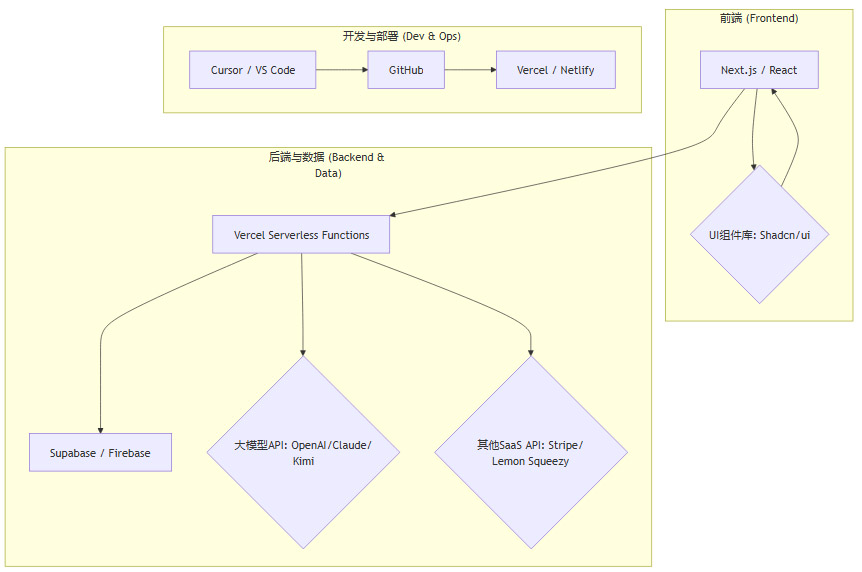 这个技术栈的核心思想是**“粘合剂”模式**。开发者的主要工作,是将前端框架、后端即服务(BaaS)、大模型API以及其他各种SaaS服务,像乐高积木一样拼接起来,快速构建出功能完整的应用。基础设施的复杂性被完全屏蔽,开发者可以100%专注于业务逻辑的实现。