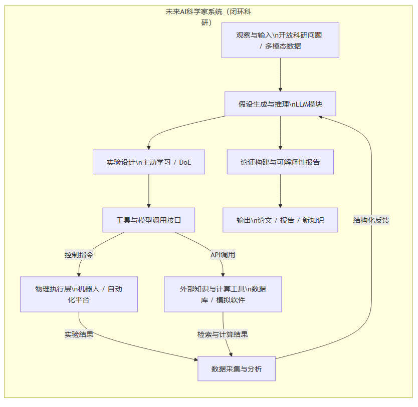 基于上述分析,AI科研能力的未来演进,可能会沿着几个关键方向展开,其核心是构建一个能够自主进行“观察-假设-实验-学习”完整闭环的智能体系统。