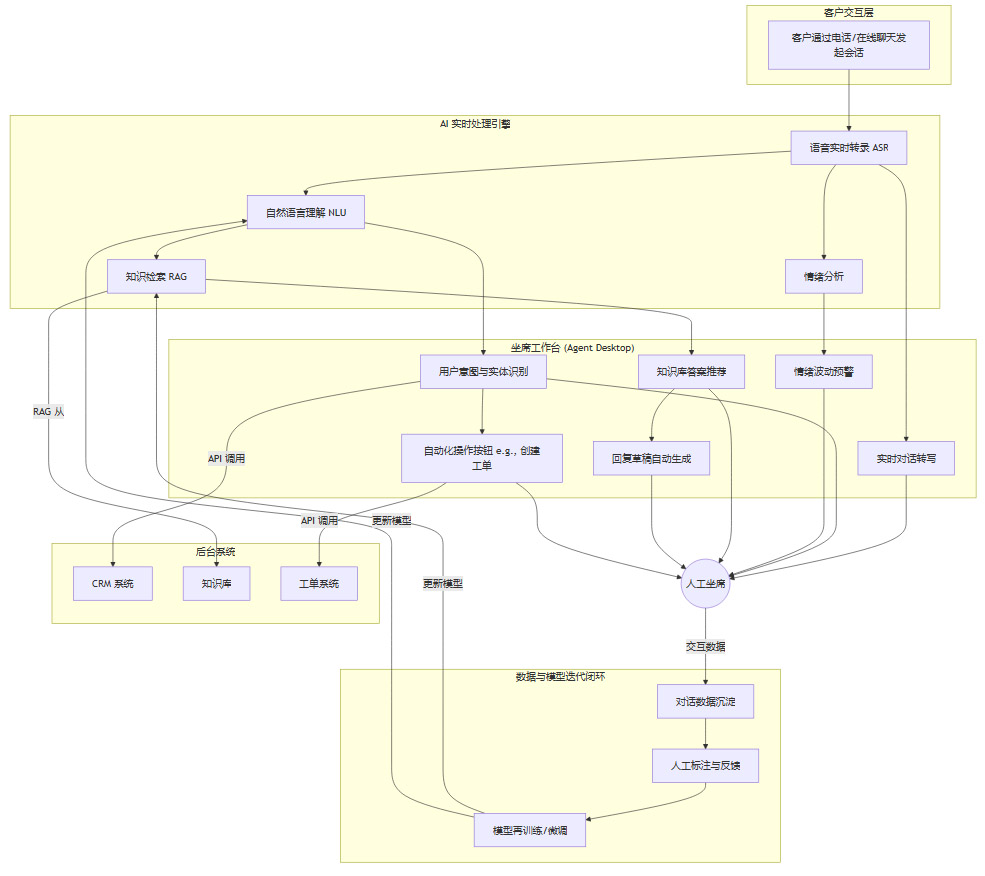 下面是一个典型的“坐席副驾驶”系统架构的 Mermaid 流程图。