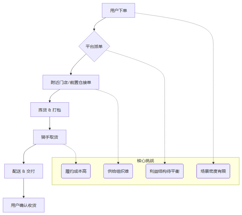 “万物到家”的即时零售被寄予厚望,它满足了消费者对“快”和“便捷”的极致追求。然而,要使其成为真正意义上的“渠道第二曲线”,仍需克服诸多技术与商业模式上的挑战。我们可以用一个流程图来拆解即时零售的运作逻辑及其中的关键节点。