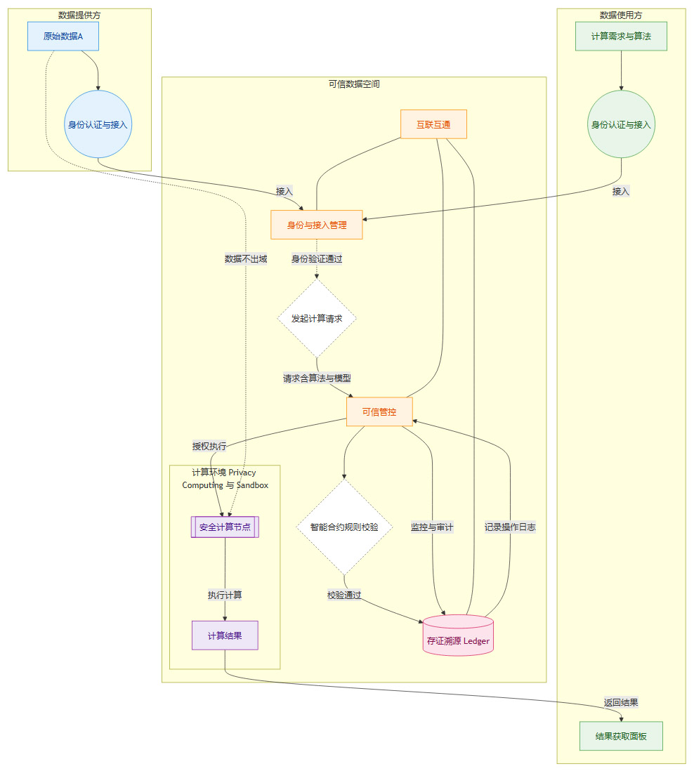 可信管控 这是整个空间的大脑。它依据预设的规则(通常由智能合约实现),对数据流转的全过程进行动态的、细粒度的权限控制。每一次数据访问、计算和使用的请求,都必须经过该模块的严格校验,确保操作的合法性。