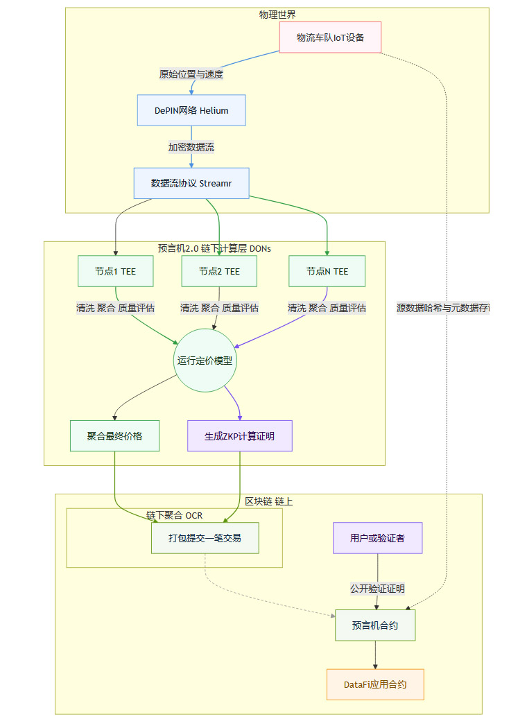 这个流程清晰地展示了数据是如何从物理世界的传感器出发,经过DePIN网络和数据流协议的传输,进入“预言机2.0”的链下安全计算环境,在其中被处理、定价并生成密码学证明,最终以一种高效、可信、可验证的方式呈现在链上智能合约面前。这正是“预言机2.0”的核心价值所在。