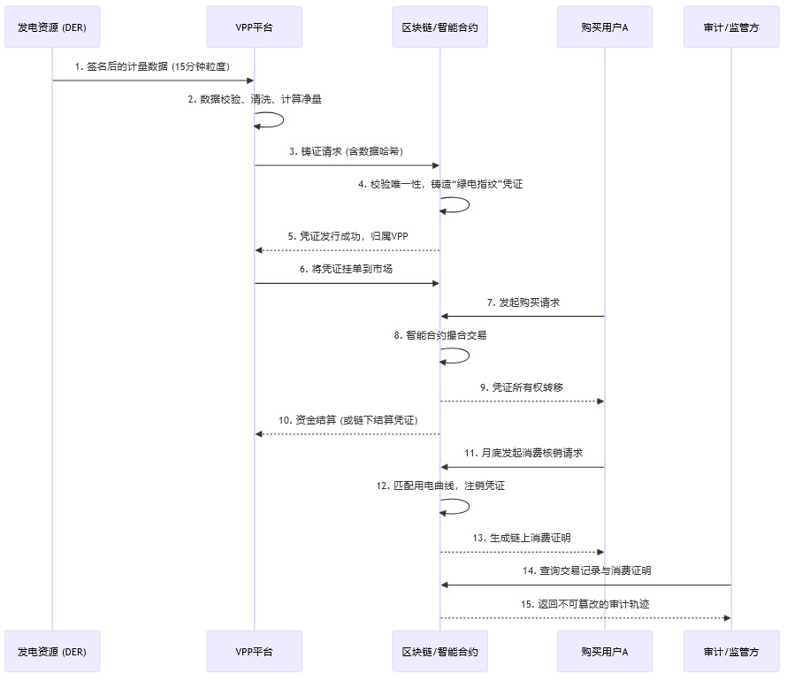 计量点ID + 起始时间检查唯一性。验证通过后,创建新的凭证,记录所有元数据,并将所有权赋予VPP的链上地址。储能场景的特殊处理: 如果发电量来自储能设备放电,铸证时必须引用其充电来源。例如,某储能设备在中午用光伏充电,晚上放电。其放电产生的凭证必须标记其“绿色血统”源自中午的光伏充电凭证。如果充电来源是混合电力(如夜间低谷火电),则其放电凭证不能被标记为100%绿色,或者需要按比例标记绿色成分。这从机制上杜绝了利用储能进行“绿电洗白”。