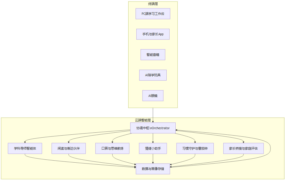 【摘要】面向小学一至三年级,构建多智能体与多终端协同的AI陪学系统,兼顾学科学习、情绪支持与习惯养成。