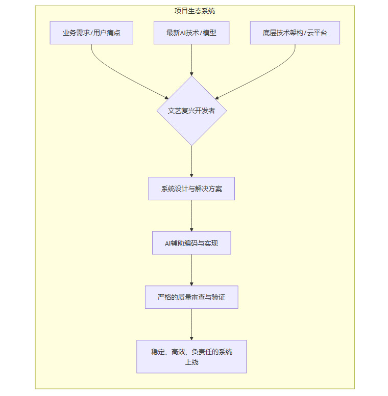 这张图清晰地表明,“文艺复兴开发者”是连接业务、AI和工程实践的核心枢纽,其价值体现在整个软件生命周期的高阶决策与质量保障环节。