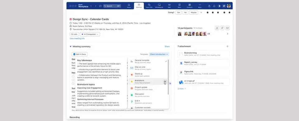 会议管理:生成会议议程,提供基于模板或历史议程的推荐内容,并在会议期间提供实时笔记。会议结束后,自动生成会议总结和行动项目,并将其嵌入到Zoom文档中,方便用户跟踪和管理后续任务。