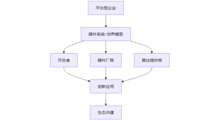 平台型企业希望通过标准化、开源和数据共享,降低行业门槛,推动规模化应用。操作系统、世界模型、数据集、算法接口的开放,吸引开发者和合作伙伴共建生态,形成“平台+生态”协同创新格局。