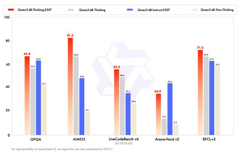Qwen3-4B-Instruct-2507和Qwen3-4B Non-Thinking整体表现略逊一筹,尤其是在AIME25和Arena-Hard v2上分数较低。