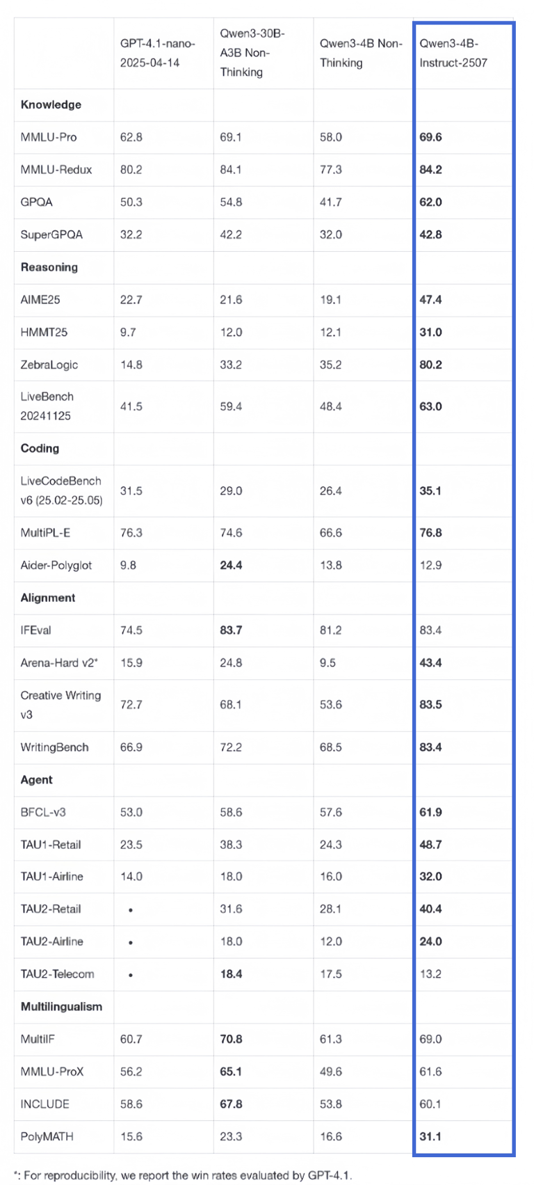 为全面评估Qwen3-4B系列模型的性能,本文选取了GPQA、AIME25、LiveCodeBench v6、Arena-Hard v2、BFCL-v3等主流基准测试,涵盖知识、推理、编程、对齐、Agent等多维度能力。