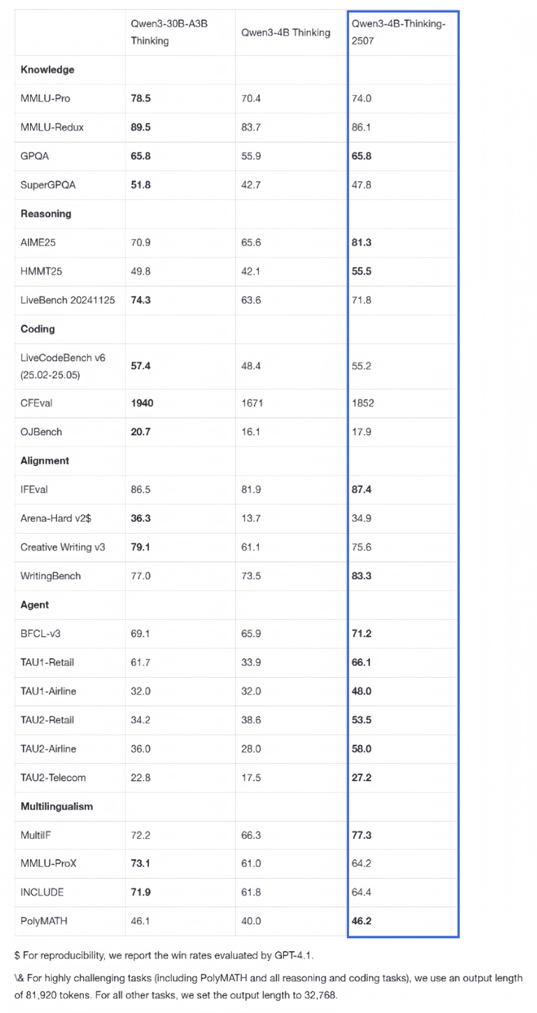 综合来看,Qwen3-4B-Thinking-2507在同参数量模型中表现突出,尤其在推理和多语言能力上有明显优势。