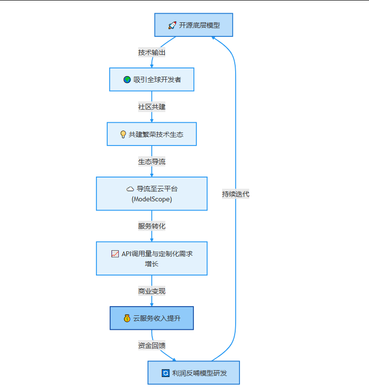 开源并非纯粹的公益,它同样是一种高明的商业战略。通过开放底层模型,阿里巴巴正在构建一个以自己为核心的技术生态,并从中实现商业价值的转化。这个过程可以被看作一个“价值飞轮”。
