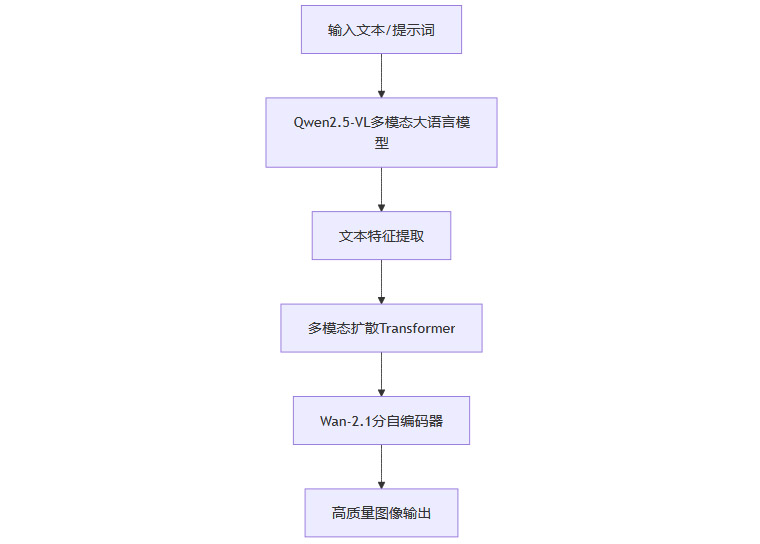 Qwen-Image的技术架构融合了三大核心组件,实现了文本、图像等多模态信息的高效协同。