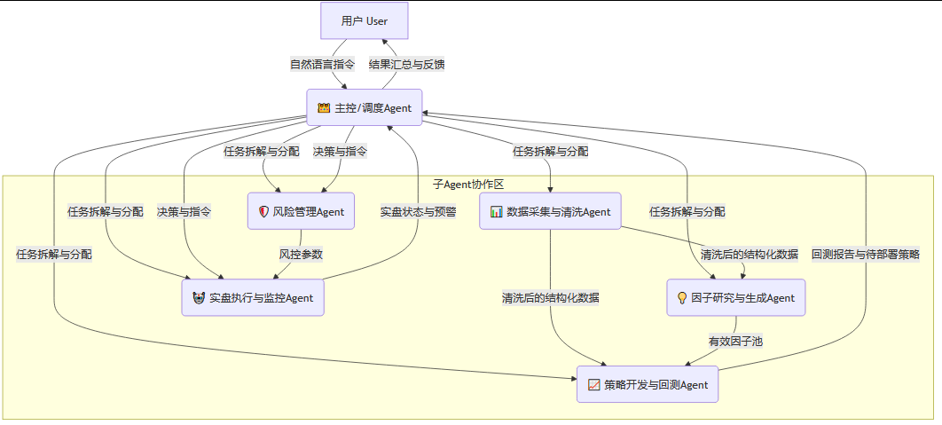 功能子Agent (Functional Sub-Agents),它们是各自领域的专家。每个子Agent都专注于一项特定任务,比如数据采集、因子挖掘、策略回测等。它们接收主控Agent的指令,高效完成自己的工作,并将结果返回。