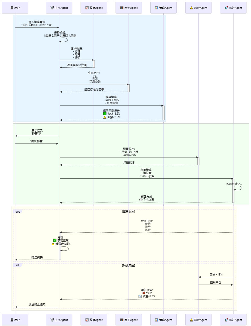 主控Agent (Master Agent),它扮演着项目经理或团队大脑的角色。它不直接执行具体任务,而是负责理解用户的最终意图,将一个模糊的、高层次的策略想法(例如“寻找近期有高管增持的低估值小盘股策略”)拆解成一系列清晰、可执行的子任务。然后,它将这些任务精准地分发给对应的功能子Agent,并负责协调它们之间的工作流,处理异常,最终将结果汇总呈现给用户。