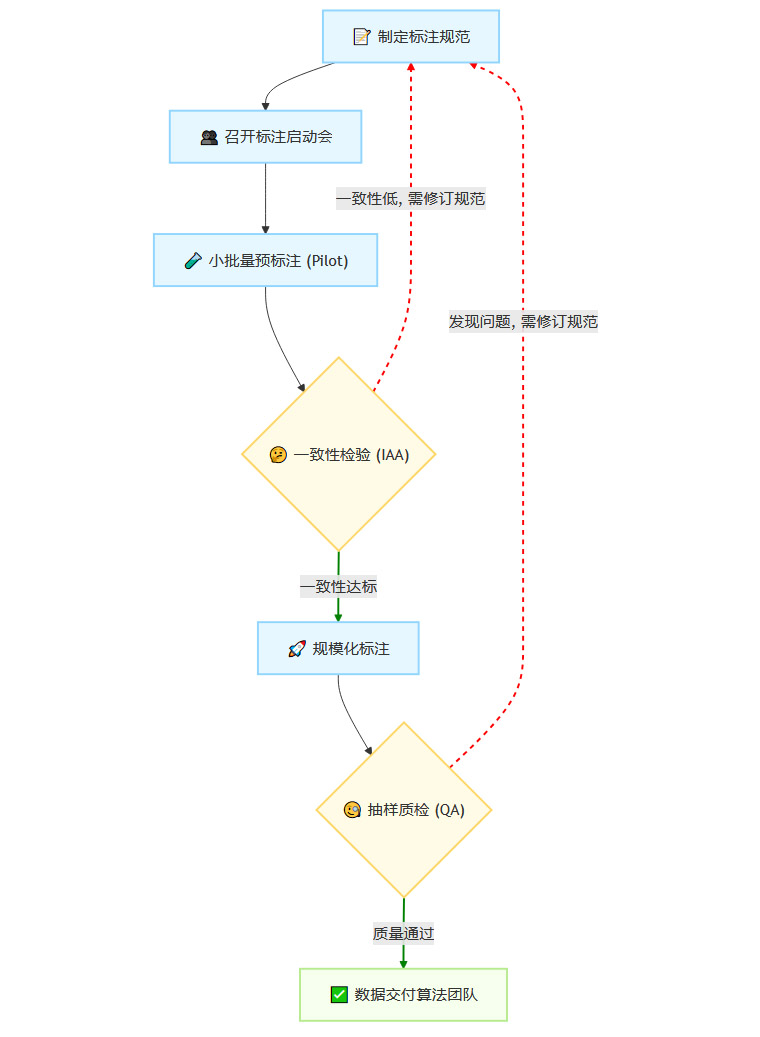 在标注开始前,组织所有标注员进行培训,逐条讲解规范,并现场解答疑问。确保每个人对规则的理解都在同一个频道上。一致性检验(IAA, Inter-Annotator Agreement)