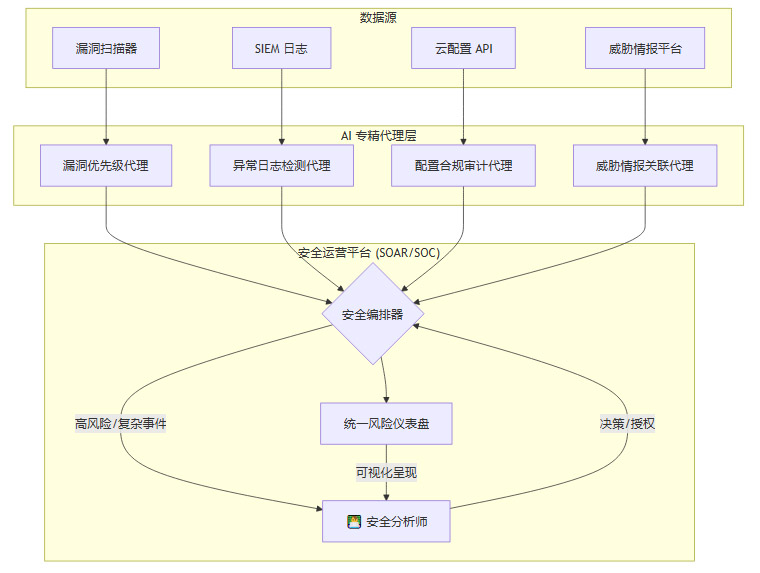 这些专精代理各自为战,又可以通过 API 和工作流引擎被整合进一个更大的安全框架中,形成一个高效的“人机协同”体系。