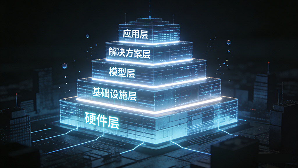 一个常见的分层方式包括硬件层、基础设施层、模型层、中间件与工具层、行业解决方案层和终端应用层。每一层有不同的技术门槛和业务形态,对应的利润率和估值倍率也不同。