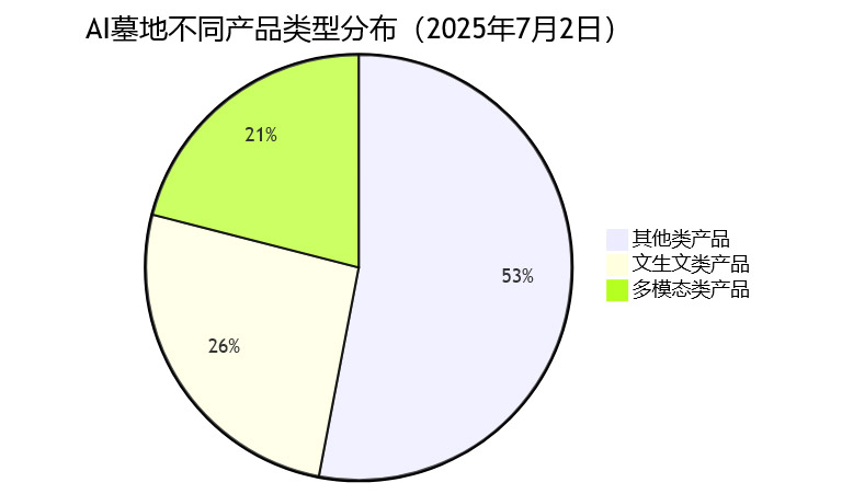 AI Graveyard的1289个项目,类型分布极具代表性。我们将其粗略分为三大类:文生文类产品、多模态类产品、其他类产品。下表与饼状图直观展现了各类项目的“死亡”比例: