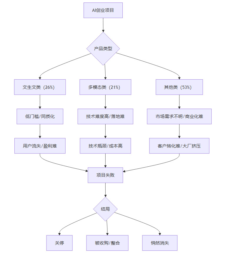 AI图像、AI编程、AI视频、AI搜索、低代码平台、AI数据分析等领域,虽然技术含量高、市场前景广阔,但因落地难、商业化挑战大,同样成为失败项目的“集中营”。