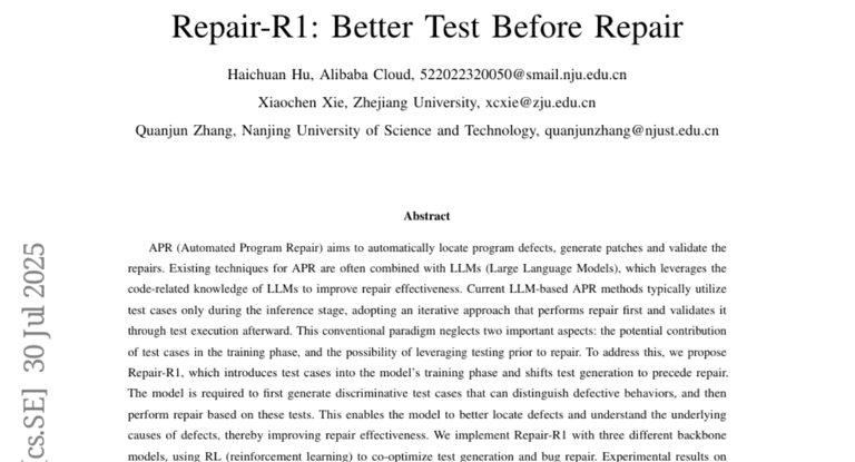 正是基于这样的洞察,来自阿里巴巴云计算公司的胡海川、浙江大学的谢晓晨以及南京理工大学的张全军等研究人员,提出了一个具有革命性的解决方案——Repair-R1。这项于2025年7月发表在arXiv预印本服务器上的研究(论文名"Repair-R1: Better Test Before Repair",编号arXiv:2507.22853v1),其核心思想就是颠覆传统,实现**“测试在前,修复在后”**。它要求AI首先扮演一名优秀的诊断专家,生成能够准确识别问题的测试用G例,然后才基于对病因的深刻理解,去制定修复方案。