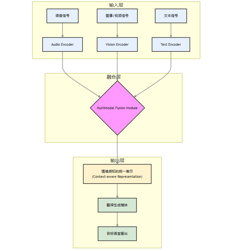 统一表示:融合后的向量形成一个包含了所有模态信息的、更丰富的“情境表示”,再送入翻译生成模块。