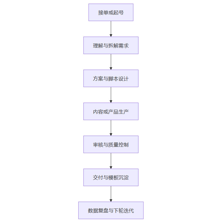 无论现在是靠手写脚本、手动剪辑,还是完全从零开始,都可以先画出理想中的工作流。将从获取需求到交付的每一个步骤拆开,哪怕暂时还没有模型参与,也先把人力流程写清楚。这张图是真正引入 AI 的基础。
