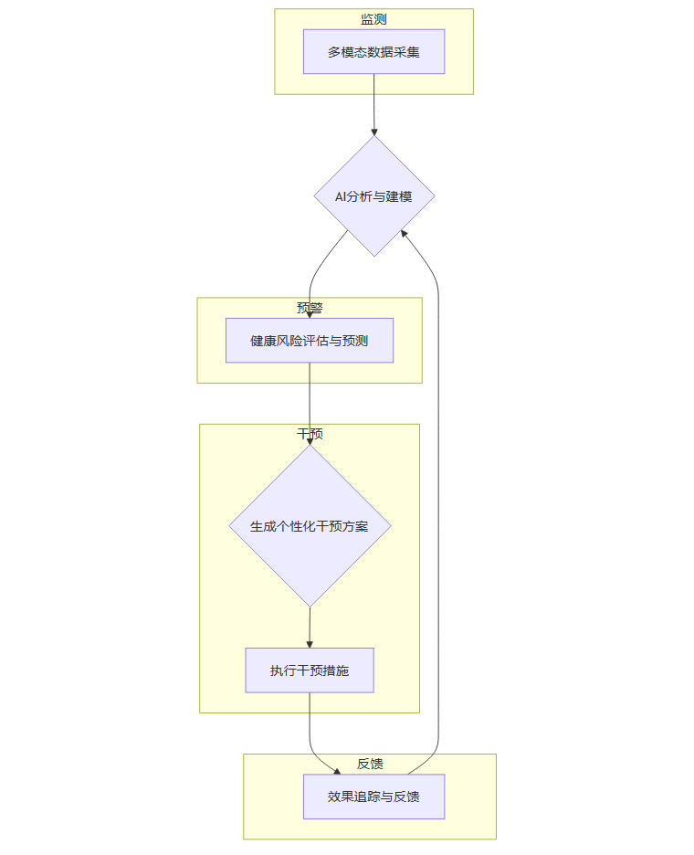 有了“数字健康孪生体”,AI便能发挥其强大的分析与预测能力,形成一个“监测-预警-干预-反馈”的完整闭环。