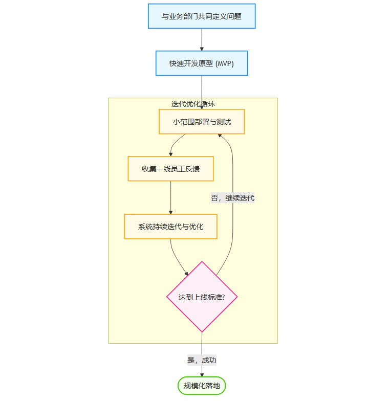这个流程图清晰地显示了问题的关键。在传统模式下,从系统部署到员工使用的反馈循环是断裂的。员工在使用中遇到的问题、提出的改进建议,无法快速、有效地传递回开发团队,系统也就无法进行及时的优化和迭代。久而久之,这个“不好用”的系统就会被彻底抛弃,项目自然以失败告终。