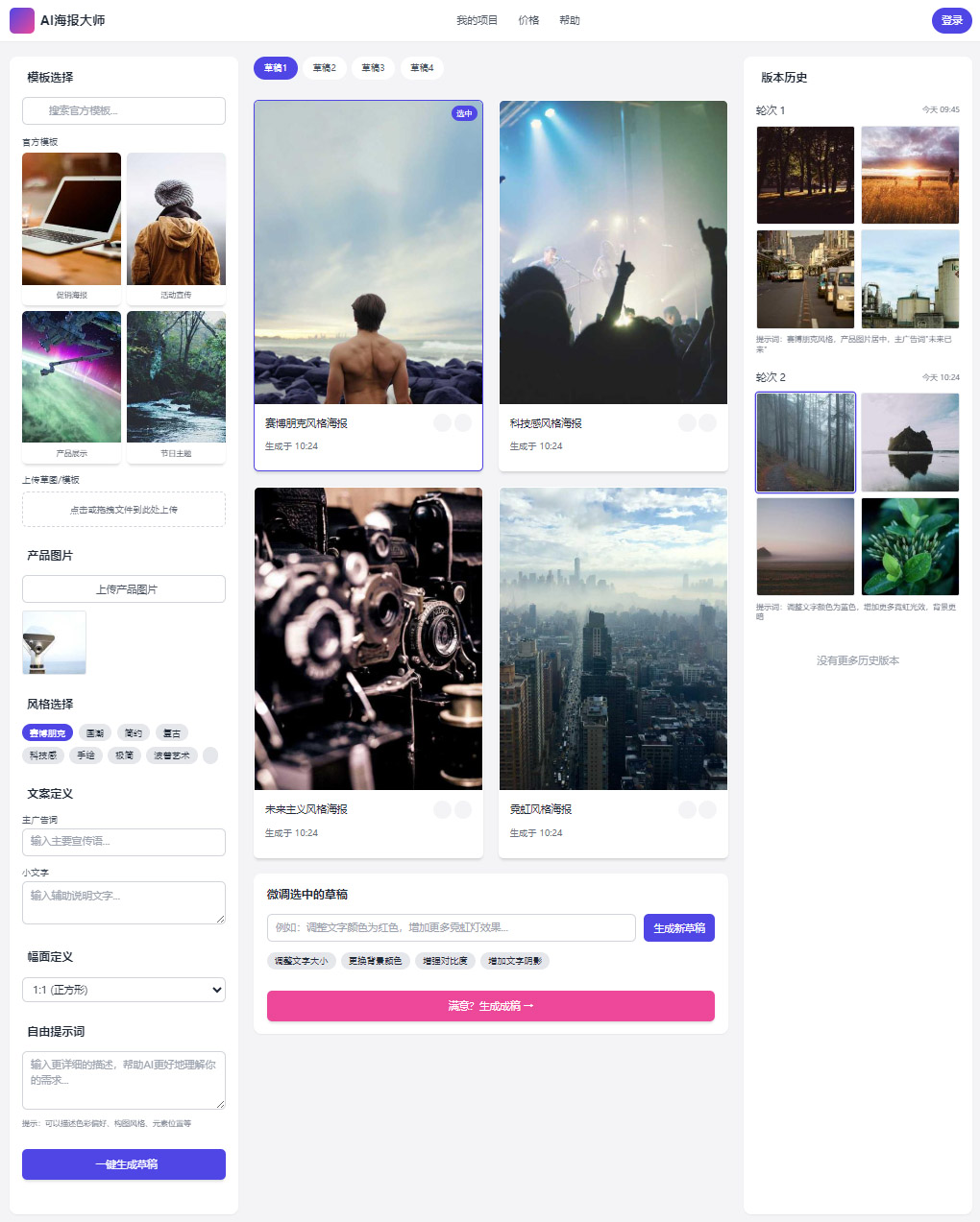 基于此定位,产品的核心价值便凸显出来,即通过结构化输入与多轮AI微调,将专业海报设计的门槛降至最低,实现“创意输入 -> 智能生成 -> 精准微调 -> 专业出品”的全流程自动化。这套流程旨在解决普通AI生图工具普遍存在的两个问题,一是用户“不知道如何描述画面”,二是AI“一次性生成的结果不尽人意”。