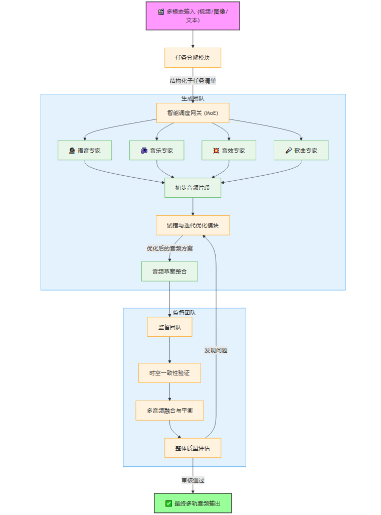 这个架构的核心,是**“生成团队”(Generation Team)与“监督团队”(Supervision Team)**的动态博弈与协作。这好比一个电影音效团队,既有负责创作的音效师、配乐师,也有一位严苛的音效总监负责最终的质量把控和整体协调。