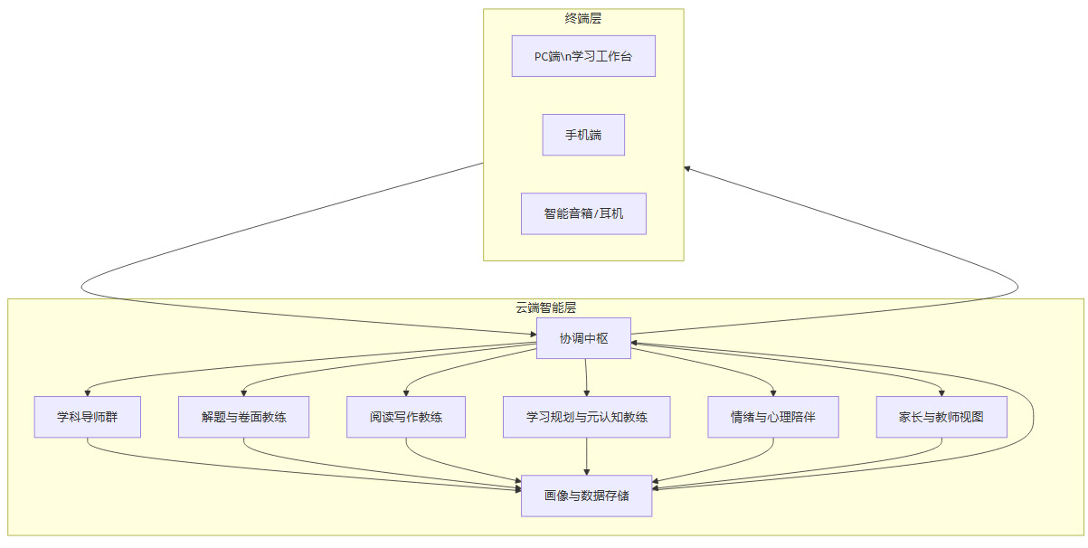 从架构上看,依托多智能体协同和多终端矩阵,系统可以在学科深化、方法养成、情绪支持和家庭协同四条主线上同时工作。在实现上,需要用知识图谱、行为画像和情绪信号构建一个长期可用的成长轨迹,而不是只盯着一次次分数起伏。在伦理上,更要坚持边界意识,对“能做但不该做”的部分保持克制。