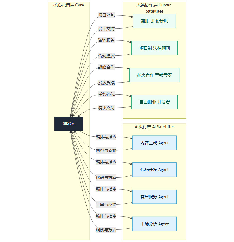 未来的组织,将不再是固化的金字塔,而更像一个以创始人为核心、由AI和外部协作者构成的动态网络,或者称之为**“核心-卫星模型”(Core-Satellite Model)**。