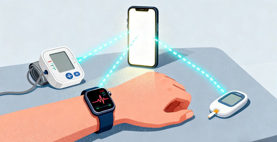 建档与设备绑定。社区医生为王大爷建立电子健康档案,并帮助他绑定智能手表和血压计。