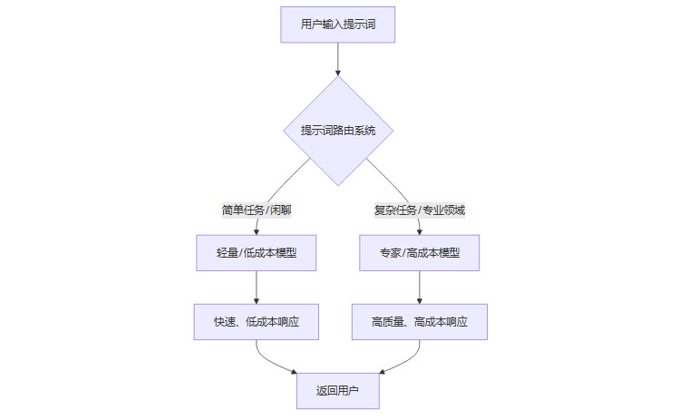 简单说,在你提交问题的瞬间,系统就给你的任务打了标签。你的提示词随即进入一个智能调度室,被指派给不同“能力”和“身价”的大模型。简单问题,交给最便宜、最快的“实习生模型”;复杂难题,立刻呼叫最贵、最强的“专家模型”。