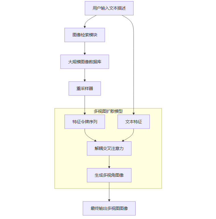 MV-RAG系统的设计哲学,是对传统生成模型的一次根本性颠覆。它不再是一个封闭的知识系统,而是一个开放的、与外部世界动态交互的智能体。其核心创新,在于将成熟的信息检索(Retrieval)技术与前沿的**多视图扩散模型(Multi-View Diffusion)**巧妙地结合在一起,构建了一套高效的检索增强生成(Retrieval-Augmented Generation, RAG)流程。