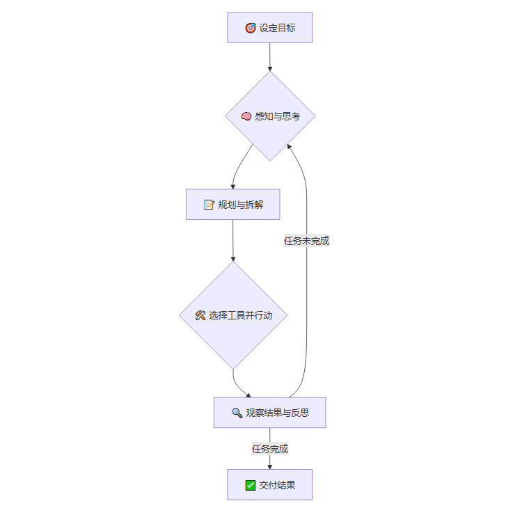 这个循环让智能体具备了动态解决问题的能力。它不是僵化地执行预设脚本,而是在每一步行动后都会评估结果,并根据新的信息调整下一步的计划,展现出一种初级的“智能”形态。