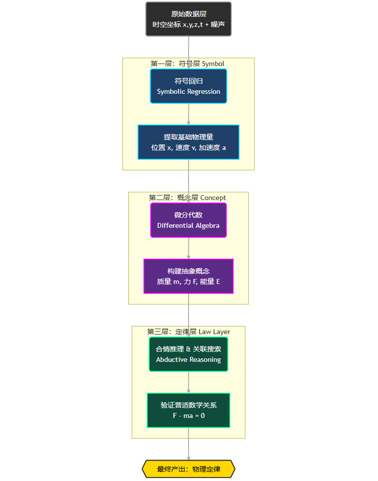“AI-牛顿”的实现路径,可以概括为一个三层知识架构的逐级构建过程。这个过程模仿了人类科学认知从具体观测到抽象总结的递进模式。