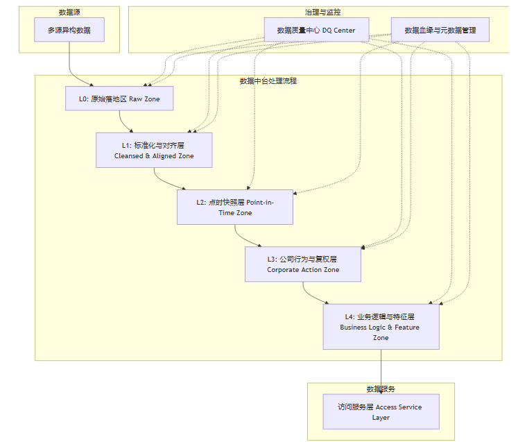 如果说数据源是“原油”,那么数据中台就是一座精密的“炼油厂”。它的任务是将驳杂的原始数据,通过一系列标准化的流程,加工成可供上层智能体和策略直接使用的高质量“成品油”——即因子和特征。