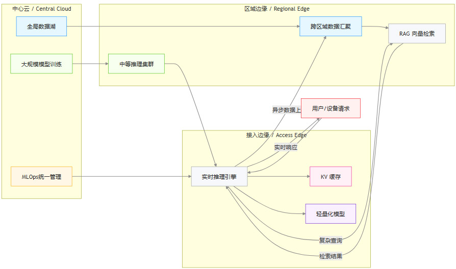 这种分层设计,允许数据和计算任务在最合适的层级被处理。例如,一个复杂的金融反欺诈请求,可能在接入边缘完成初步的特征提取和模型推理,若需更丰富的历史数据,则智能回源至区域边缘进行RAG检索,最终仅将脱敏后的结果异步汇总到中心云用于模型迭代。