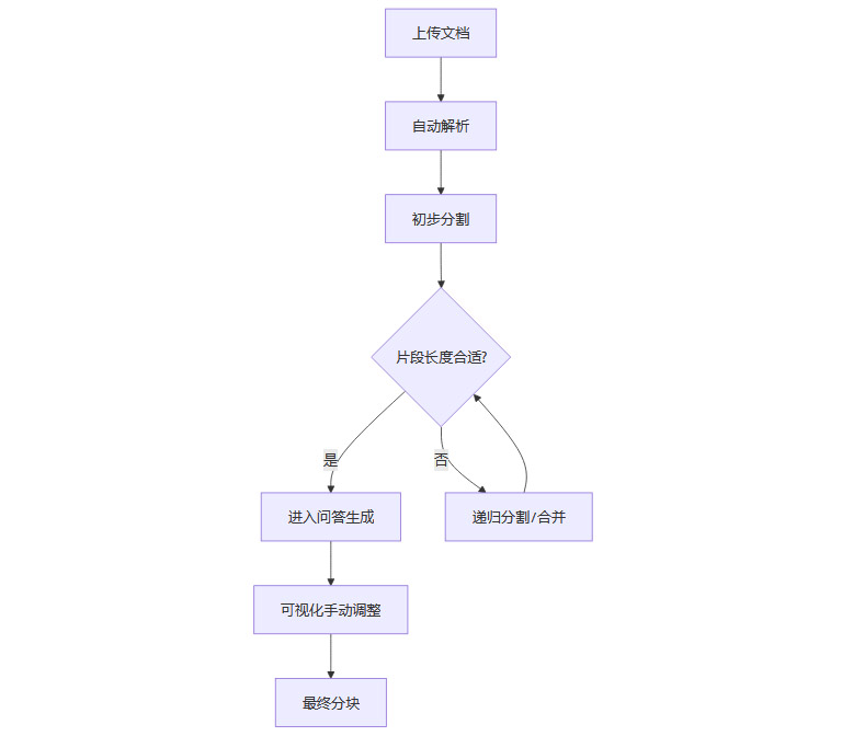自动分割:基于行分隔符、用户自定义分隔符,递归切分长段落,确保每块长度适中。