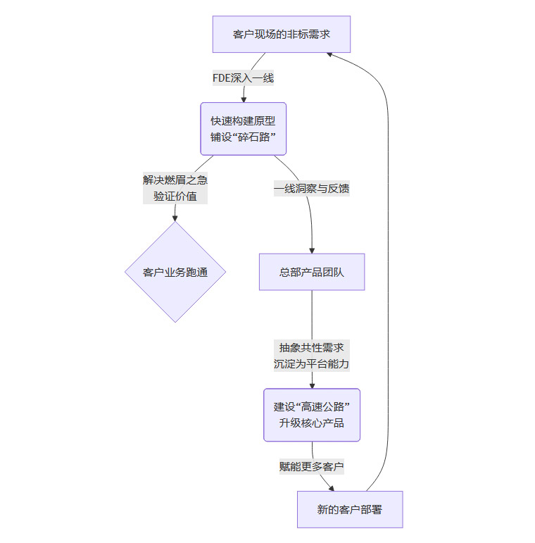 FDE在客户一线铺设的是**“碎石路”**。这些路修得很快,不求完美,但能立刻解决客户的燃眉之急,让业务“跑起来”。
