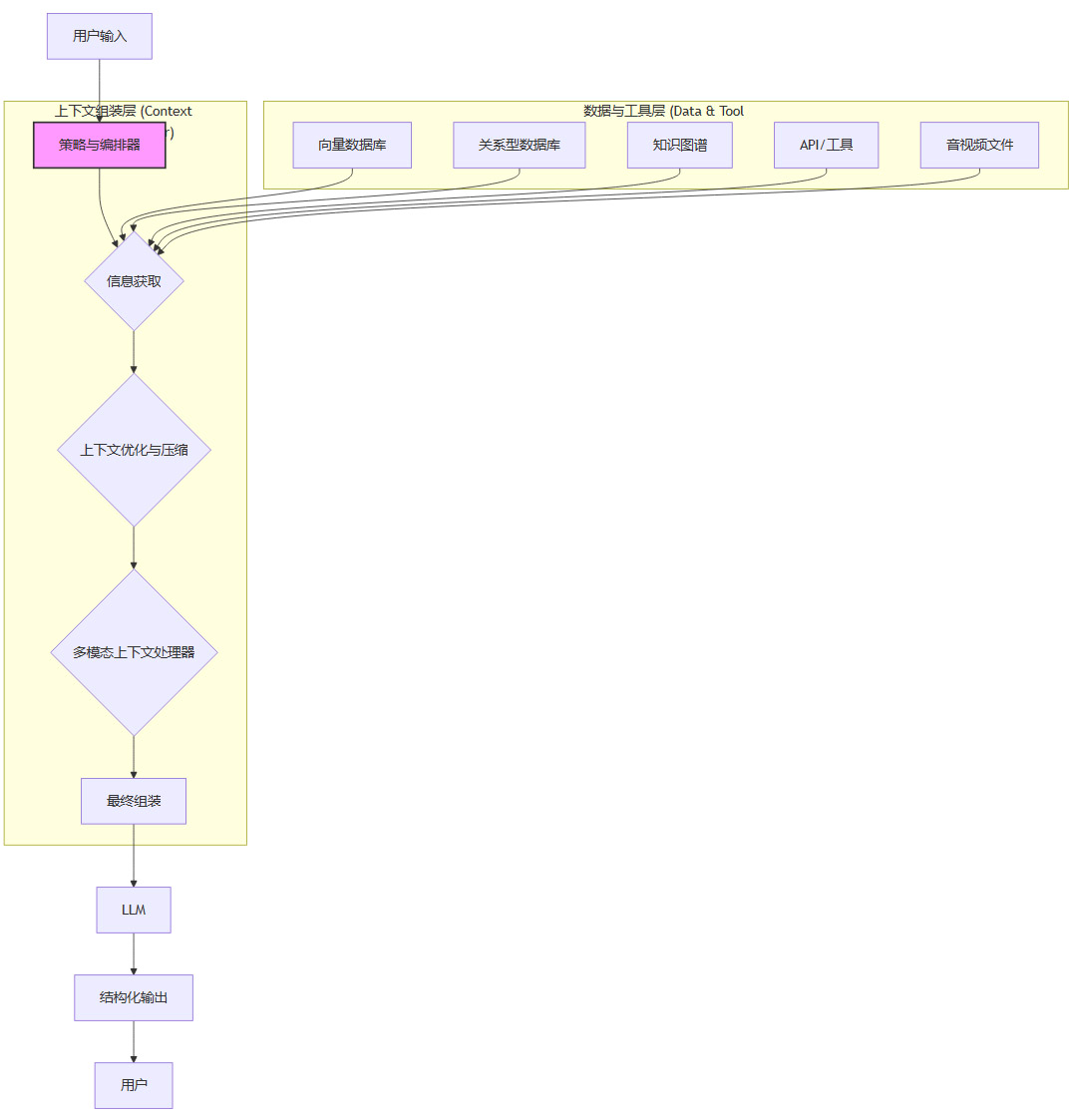 编排器根据用户意图,决定从哪些数据源获取信息。这不再局限于向量数据库,而是扩展到关系型数据库、知识图谱、外部API调用、甚至音视频文件的元数据等。上下文优化与压缩 (Context Optimization & Compression)