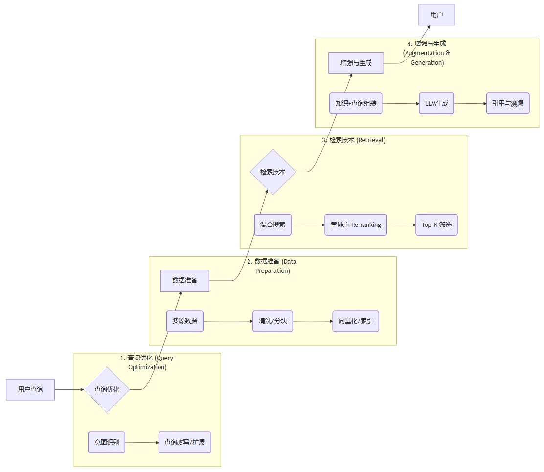 在基础的RAG方案里,用户的原始查询可以直接被向量化并用于检索。但这一步的优化,能极大提升后续环节的精准度。它通常利用模型(小模型或LLM本身)对用户输入进行意图识别、查询改写和关键词扩展。目的是让系统更准确地理解用户到底想问什么,为后续精准检索打下坚实基础。数据准备 (Data Preparation)